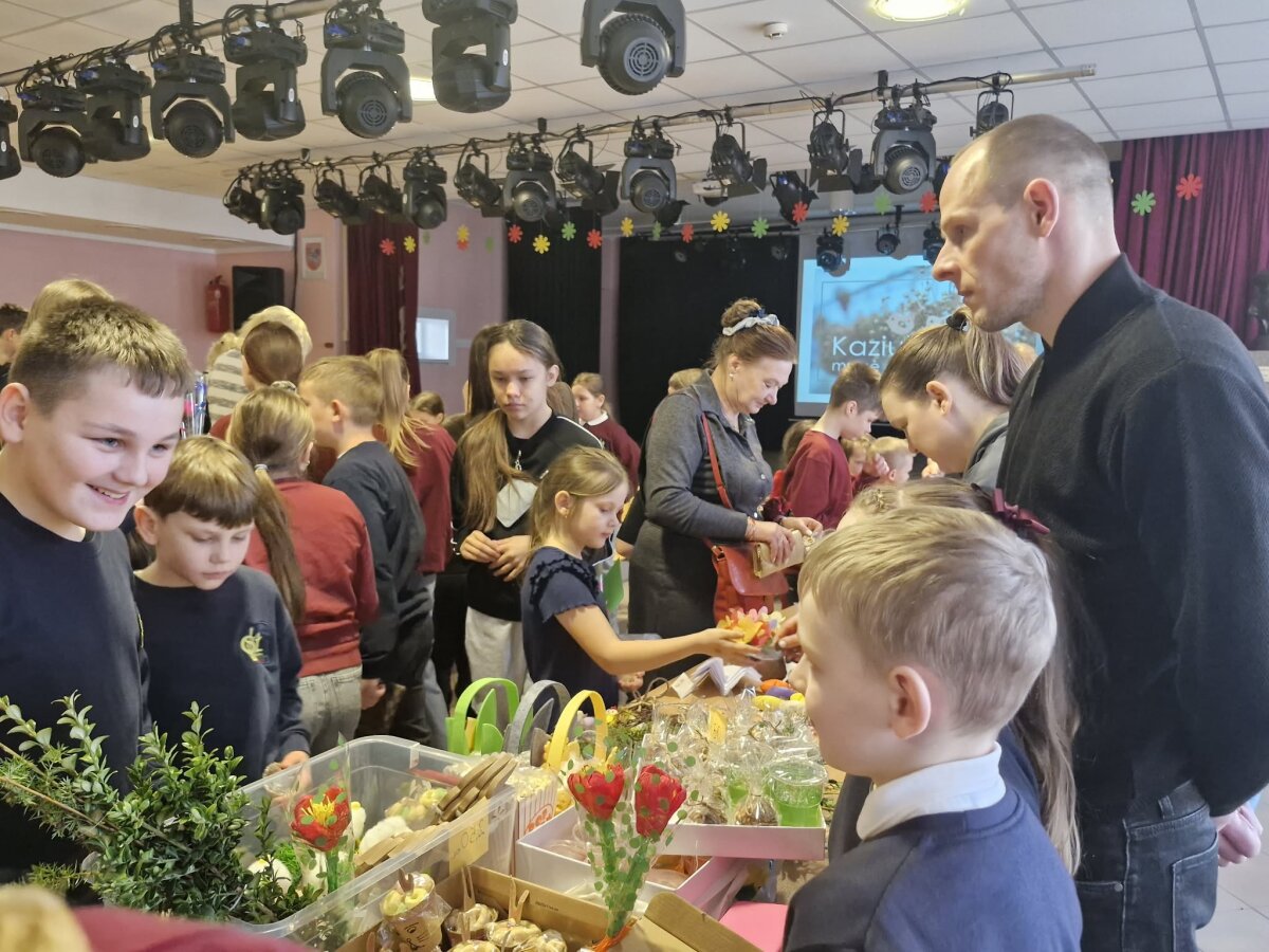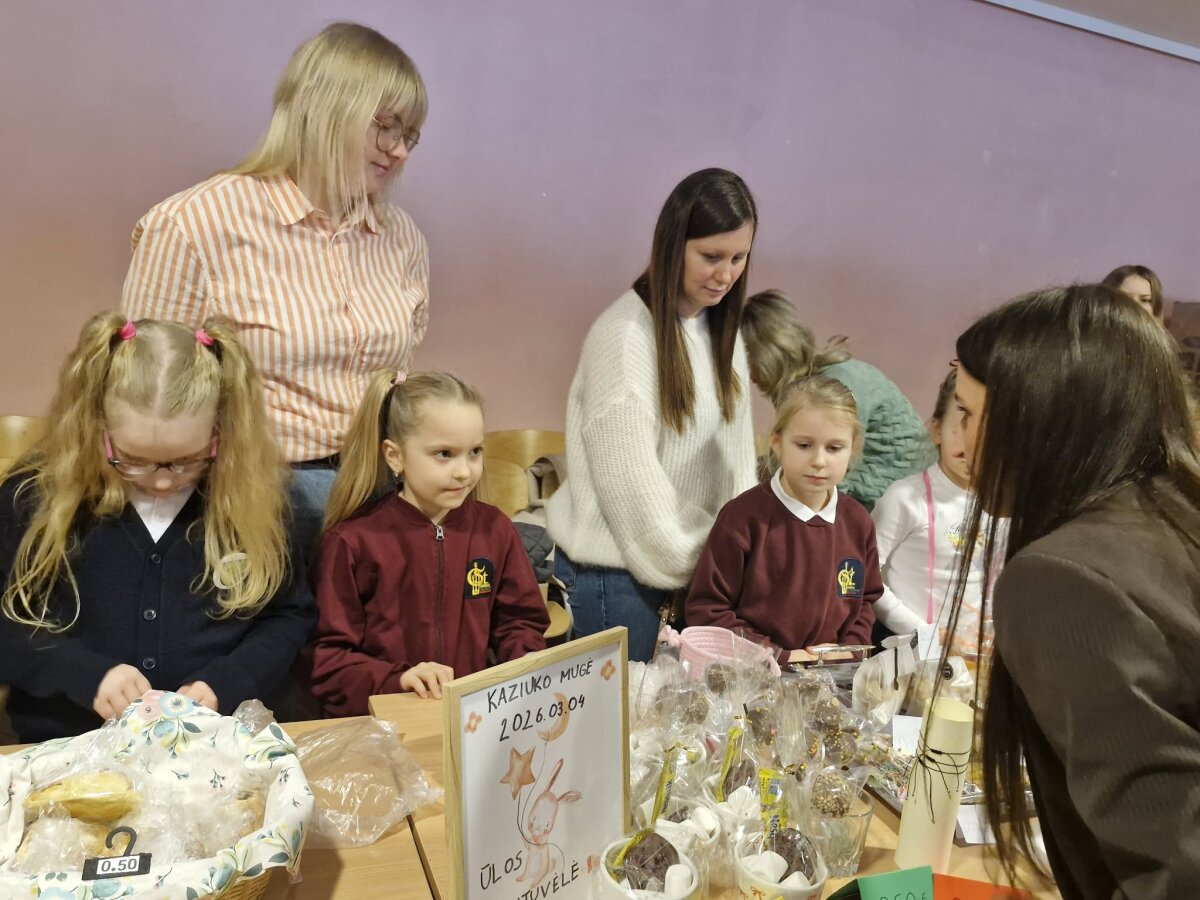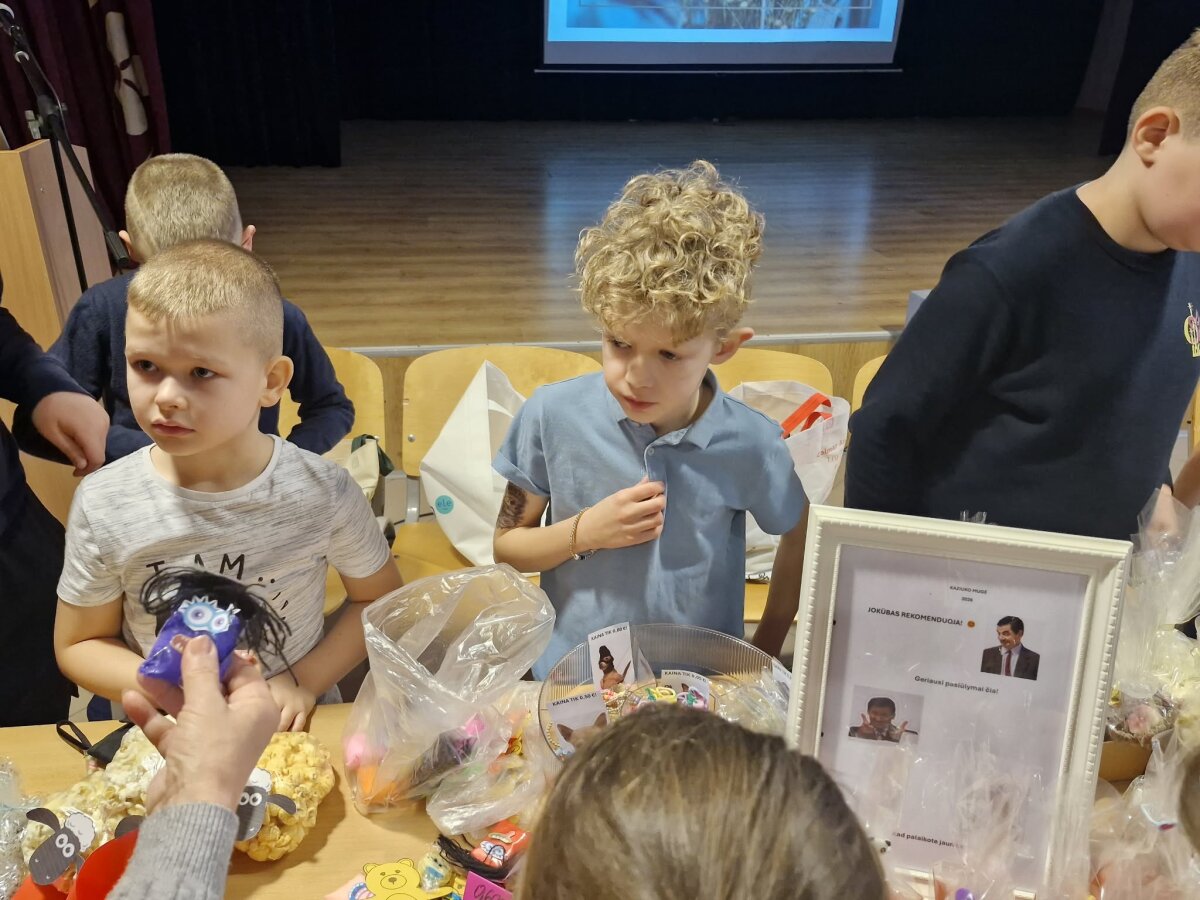 Kaziuko mugė - vienas seniausių, ryškiausių ir mėgstamiausių tradicinių renginių Lietuvoje. Šiandien, kovo 4-ąją, mugė šurmuliavo ir mūsų gimnazijos aktų salėje. Verbos, įvairūs papuošalai, kepiniai ir kiti pradinukų darbeliai gražiai sugulę ant stalų laukė pirkėjų. Vaikai pirko, pardavinėjo, keitėsi, dovanojo ir vieni kitiems dėkojo. Mugėje dalyvavo ir tėveliai, seneliai. Vyravo pavasariška šventinė nuotaika.