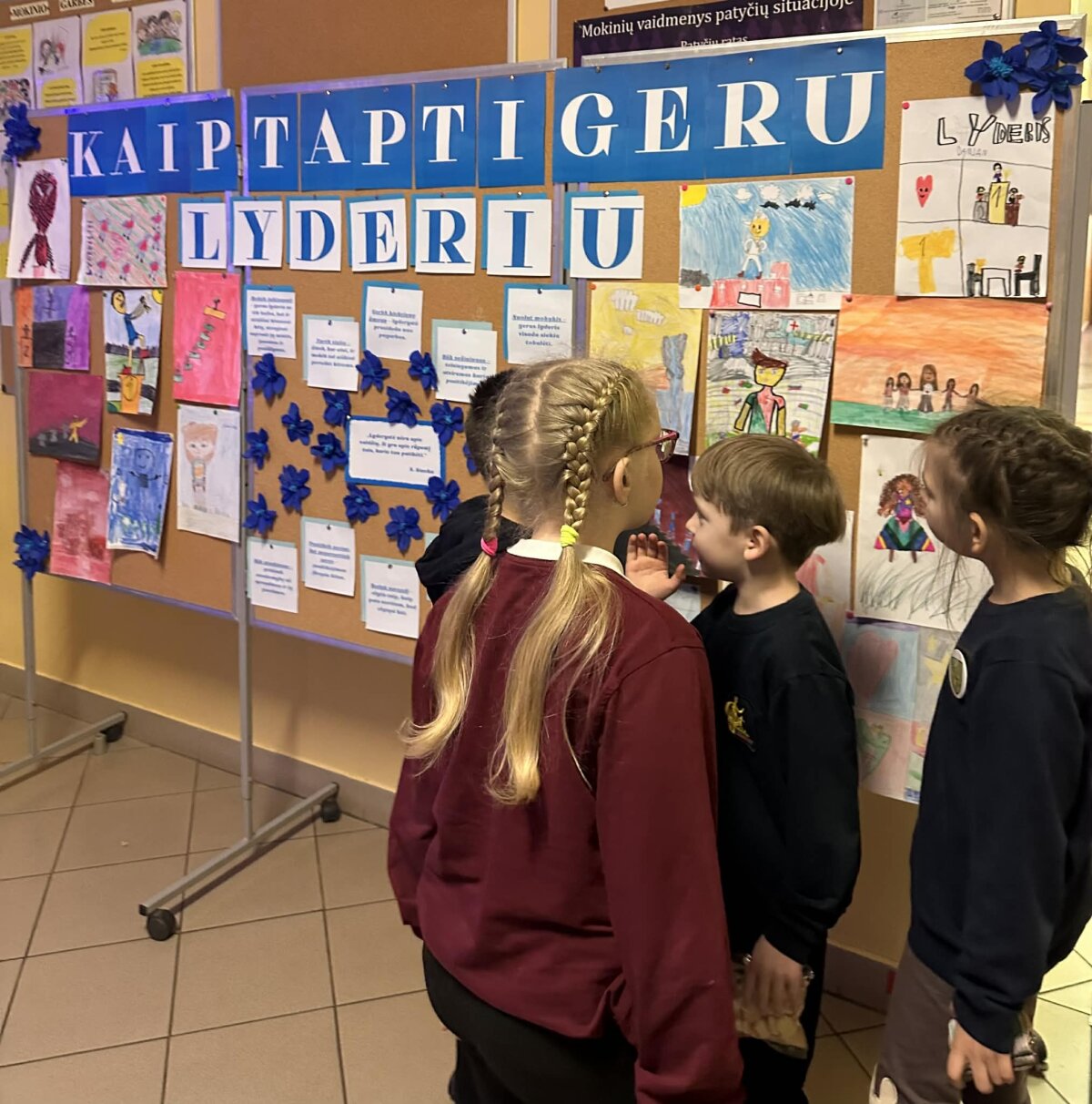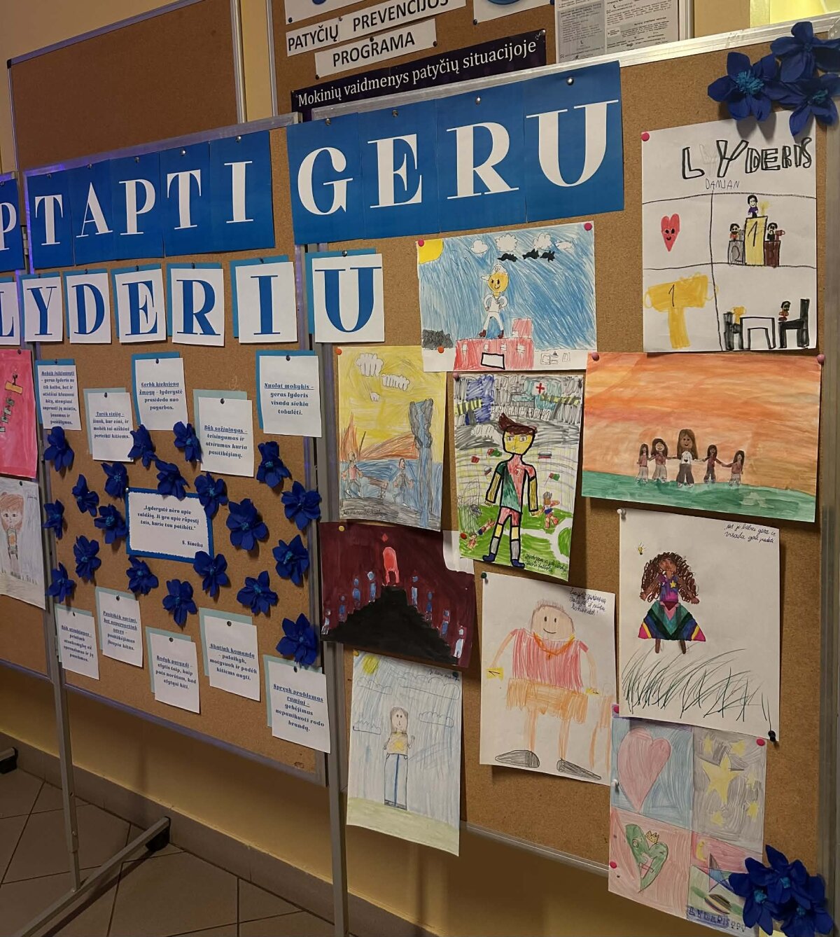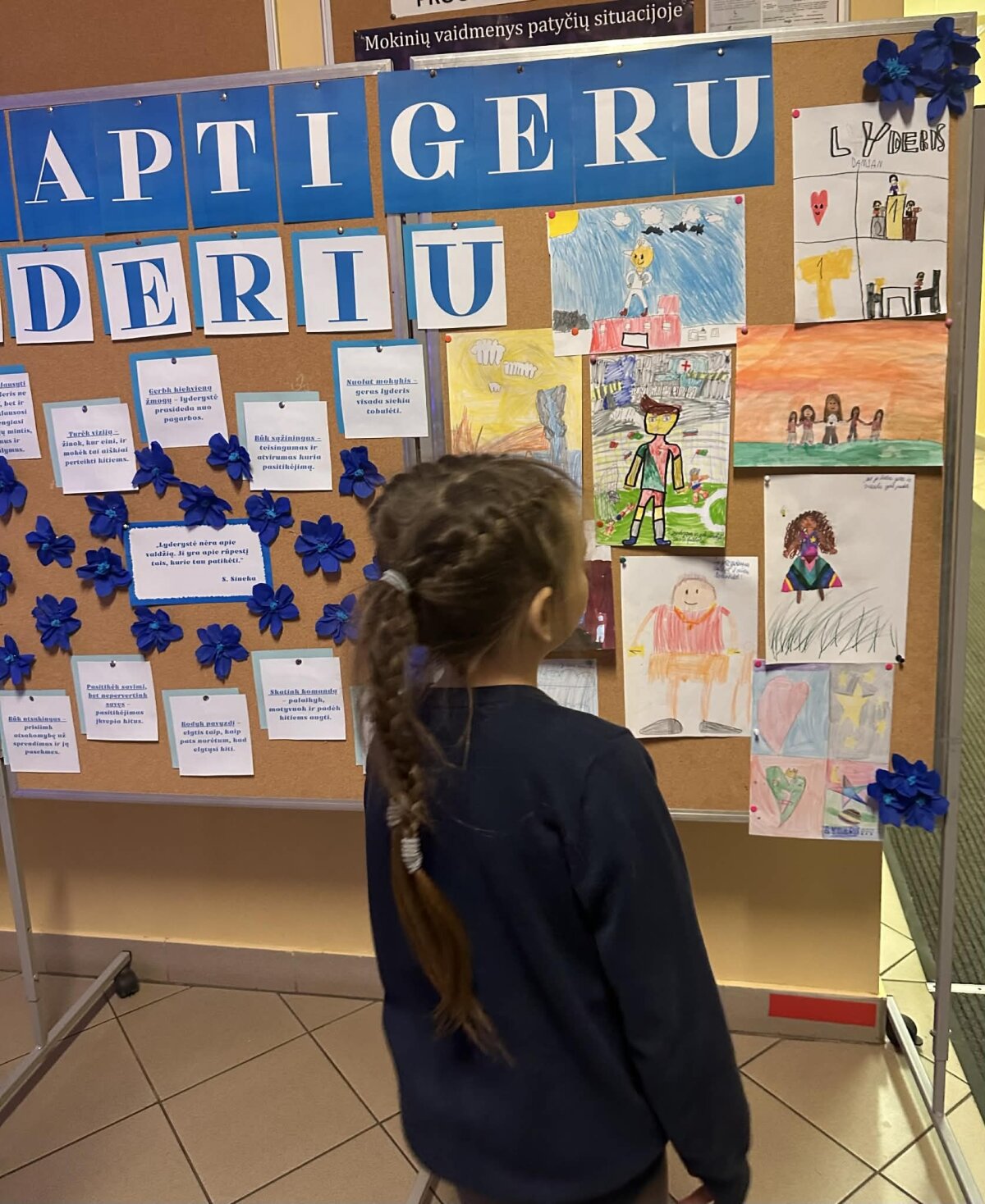 Papildydama paskaitą, Augustė parengė informacinį stendą apie lyderystę. Jame buvo įvardytos svarbiausios teigiamos žmogaus savybės, padedančios tapti lyderiu: atsakomybė, pasitikėjimas savimi, pagarba kitiems, sąžiningumas, bendradarbiavimas ir atkaklumas. Be to, stende buvo iškabinti 1–4 pradinių klasių mokinių piešiniai, atspindintys jų supratimą apie tikrąjį lyderį. Vaikų kūrybiniai darbai parodė, kad lyderis – tai ne tik vadovaujantis, bet ir padedantis, palaikantis bei gerą pavyzdį rodantis žmogus.
