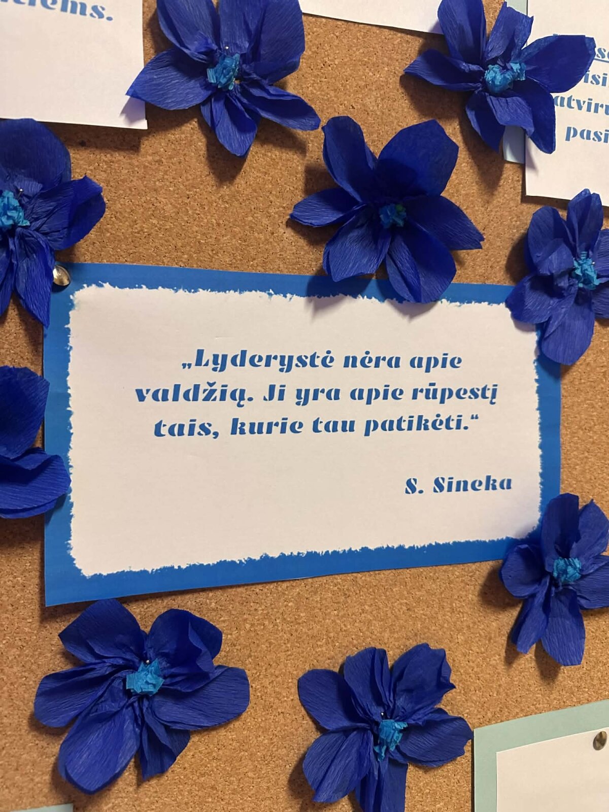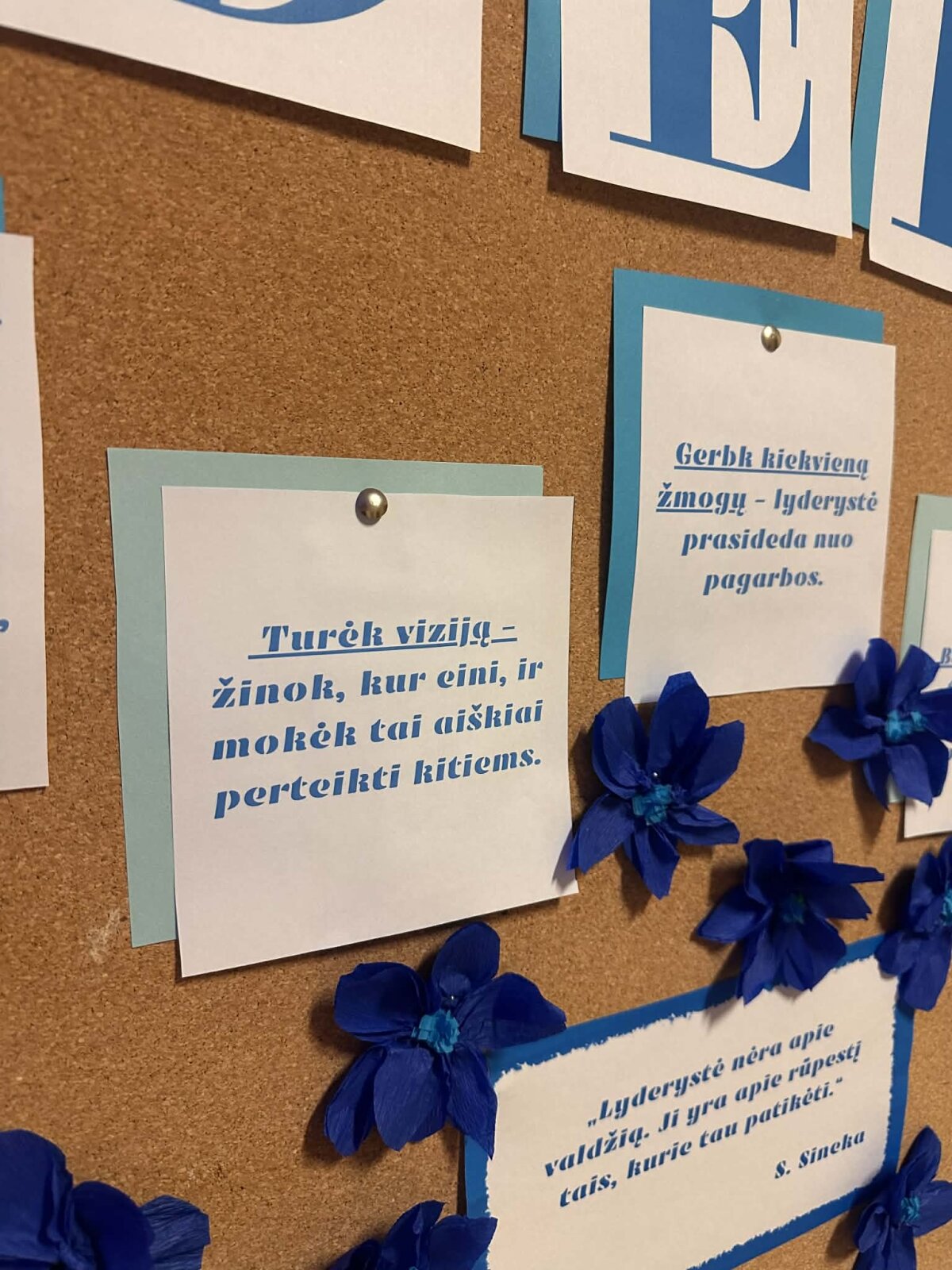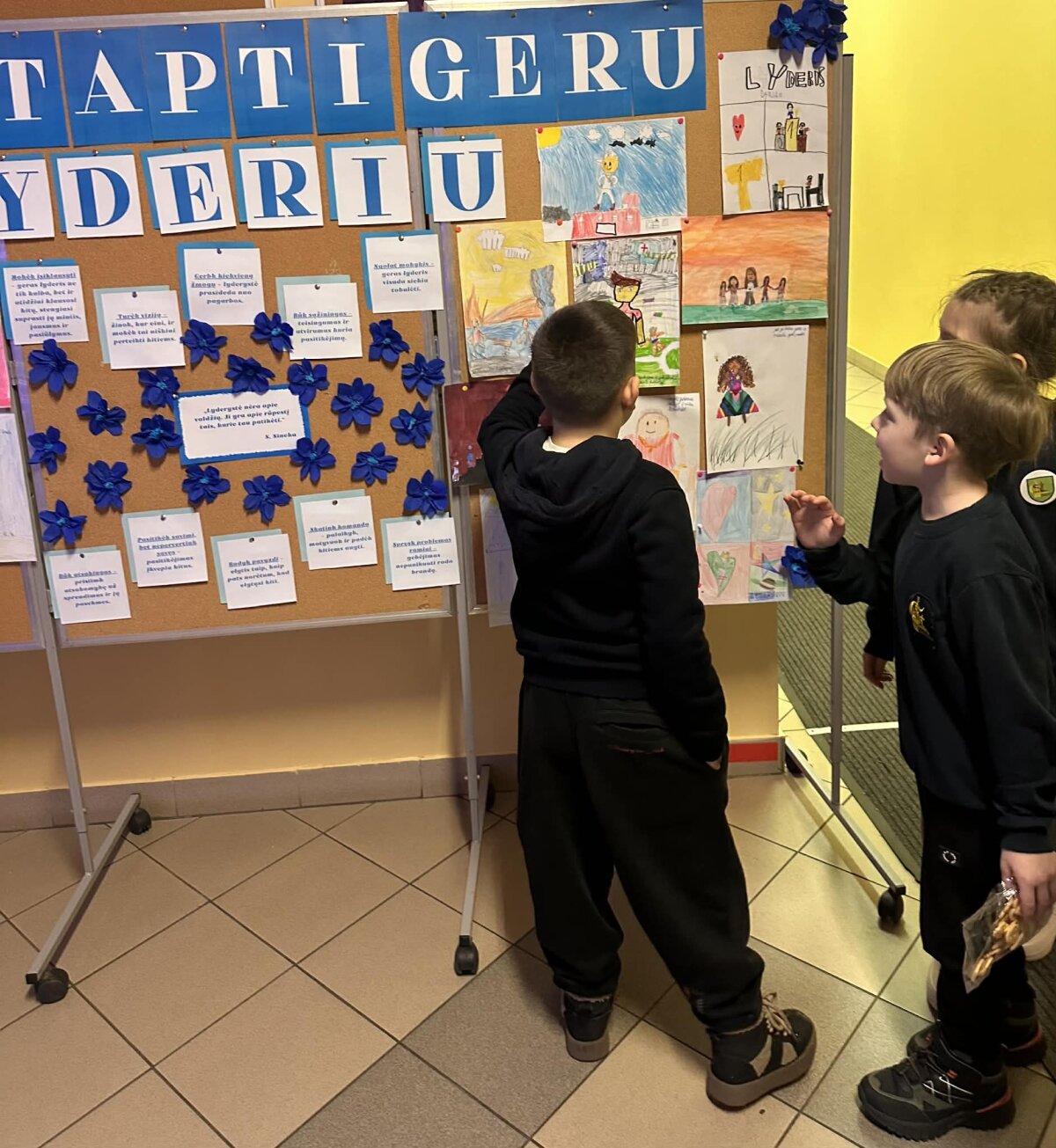 Papildydama paskaitą, Augustė parengė informacinį stendą apie lyderystę. Jame buvo įvardytos svarbiausios teigiamos žmogaus savybės, padedančios tapti lyderiu: atsakomybė, pasitikėjimas savimi, pagarba kitiems, sąžiningumas, bendradarbiavimas ir atkaklumas. Be to, stende buvo iškabinti 1–4 pradinių klasių mokinių piešiniai, atspindintys jų supratimą apie tikrąjį lyderį. Vaikų kūrybiniai darbai parodė, kad lyderis – tai ne tik vadovaujantis, bet ir padedantis, palaikantis bei gerą pavyzdį rodantis žmogus.